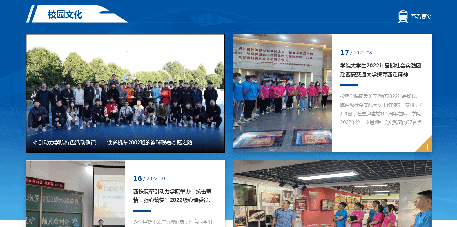 “通知公告”栏目采用列车进站的方式展示信息,既体现了文化特色,又为阅读者提供了灵动有趣的阅读感受。