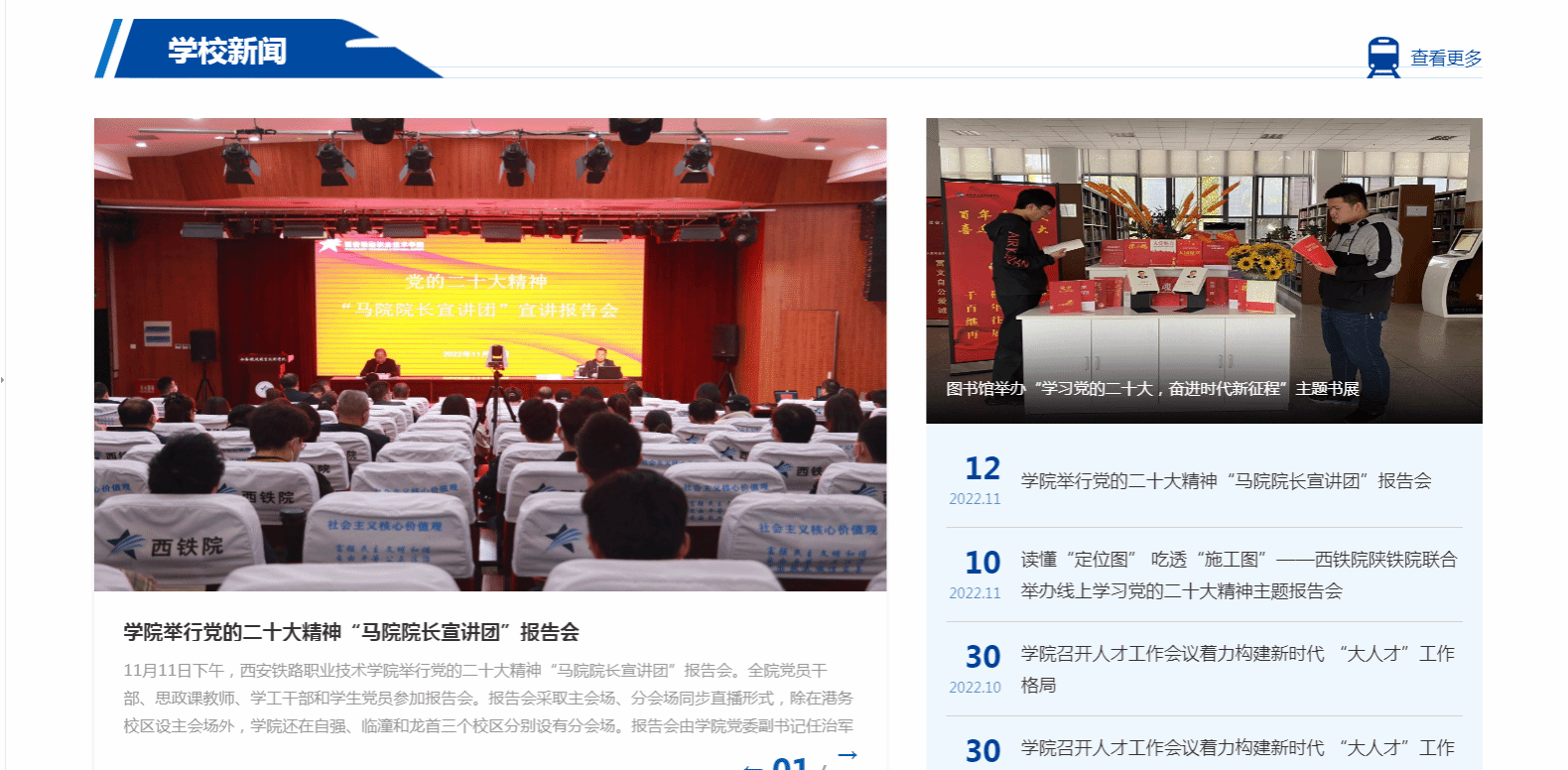新版校园网首页以学校VI系统的“西铁院蓝”为主色调,结合学校标识、校训校风、办学理念、文化特色等,通过全新设计的UI界面充分彰显了学校近七十年的轨道交通专业文化底蕴。