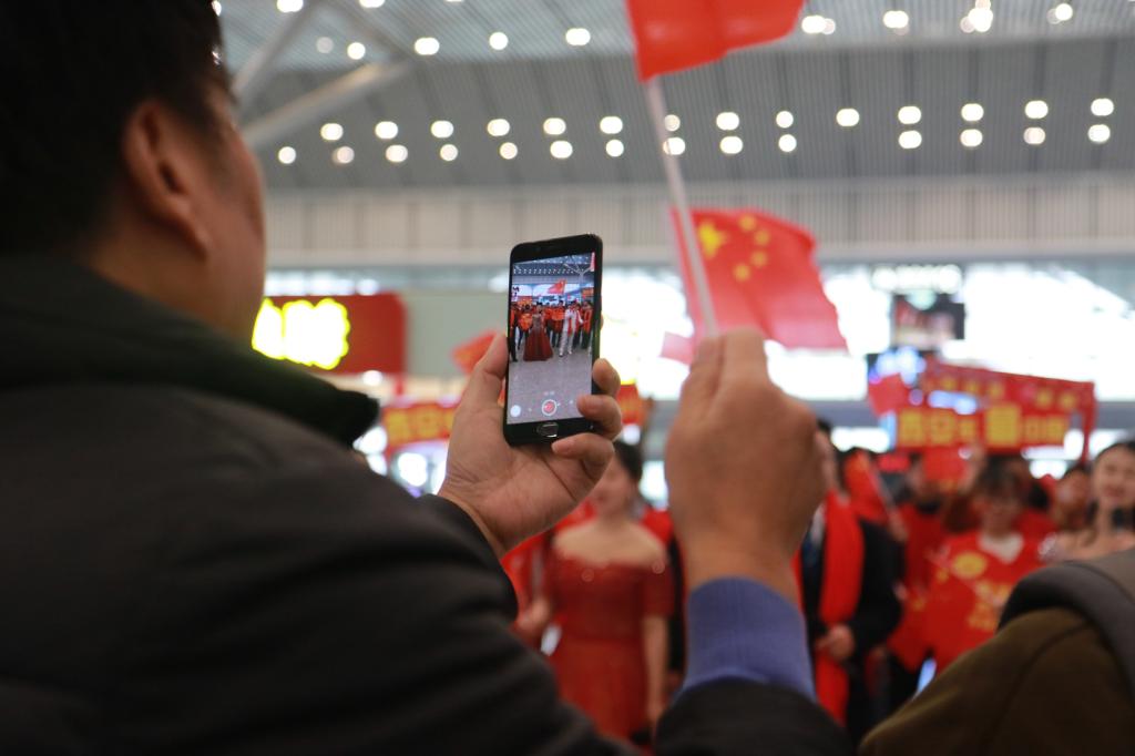 “我和我的祖国,一刻也不能分割,无论我走到哪里,都流出一首赞歌……”,快闪刚开始,学院参加2019年春运“暖冬行动”的学生志愿者奏起了动人的《我和我的祖国》二胡演奏。随后,从人群中走出的志愿者和教师代表们边走边唱,并为现场观众递上一面小国旗。这首温暖的旋律吸引了众多游客驻足聆听,旅客们被这热烈气氛感染,纷纷围聚上前,拿出手机拍照录像,并与快闪成员们一起动情共唱《我和我的祖国》,一同祝福祖国70岁华诞,优美的旋律回荡在现场的每一个角落。精彩的节目为各地游客们奉献了一场视听盛宴,时间虽短,但记忆深刻,人们手中挥舞着鲜艳的五星红旗成为了最亮丽的风景线,现场气氛热烈。学院志愿者们与教师代表通过集体合唱、舞蹈等形式共同祝福祖国70岁华诞,展现了必赢官网青年师生为祖国繁荣富强、为大西安追赶超越而努力奋斗的坚定信念与理想追求,抒发了他们对大西安发展建设所给予的美好愿望。