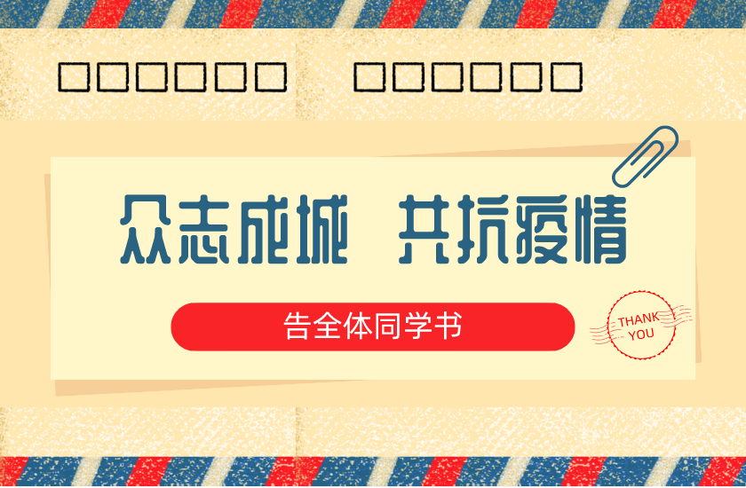 同学们,众志成城,共抗疫情!让我们以家国情怀和实际行动诠释当代大学生的新时代精神,积极主动加入到这场疫情防控阻击战当中,勇担社会责任,全力奉献爱心,在党和政府的坚强正确领导下,我们终将打赢这场没有硝烟的战役,早日迎来疫情防控战的全面胜利!让我们一起加油!
