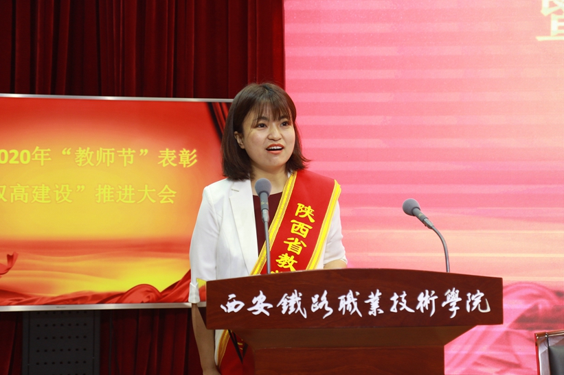 先进集体和个人代表焦雯老师发言,表达了对学院培养的感谢,表示将继续不忘初心、牢记使命,教书育人、再接再厉,为学院“双高建设”作出应有贡献。