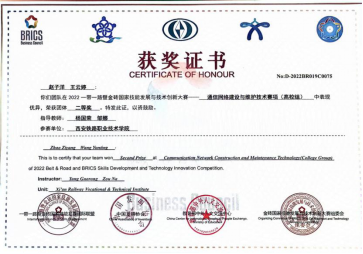 2022年12月10日,由金砖国家技能发展与技术创新大赛组委会主办、一带一路暨金砖国家技能发展国际联盟承办、塔城职业技术学院、南京中兴信雅达信息科技有限公司支持的2022一带一路暨金砖国家技能发展与技术创新大赛之通信网络建设与维护技术赛项圆满结束,经过激烈角逐,学校参赛选手赵子洋、王云婷荣获二等奖,指导教师杨国荣、邹娜荣获优秀指导教师,学校荣获优秀组织奖。