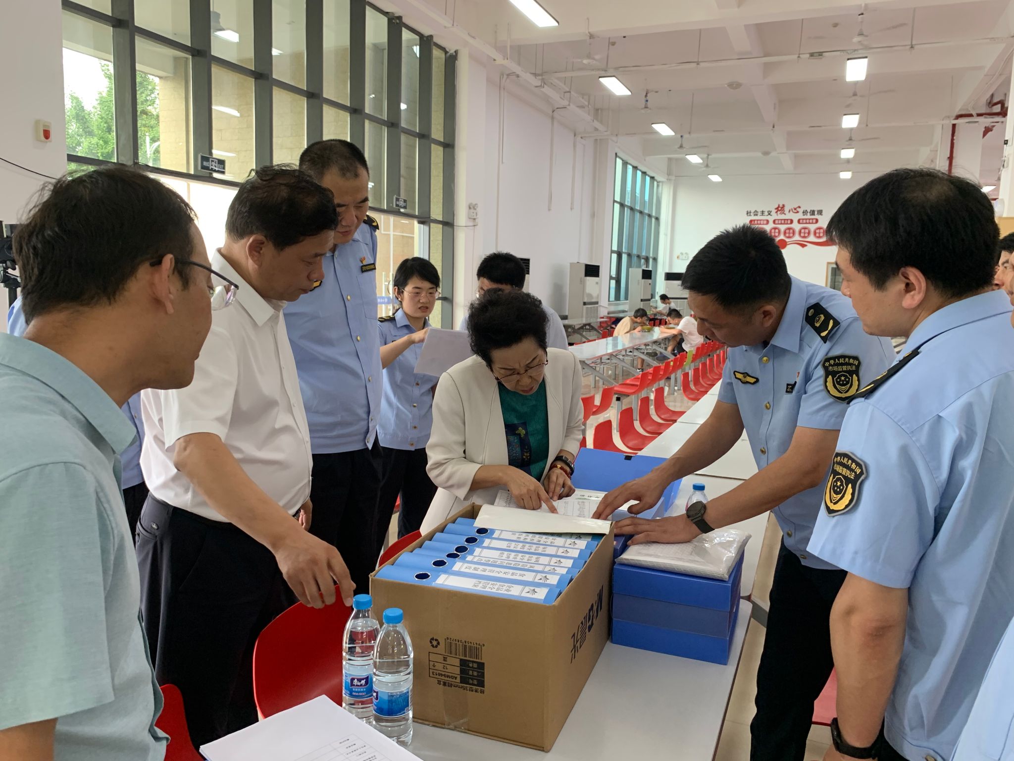 在餐饮中心一层大厅,熊奇向李培荣专员汇报了学校办学和食堂食品安全生产与管理等基本情况。李培荣一行检查并了解必赢官网《落实食品安全“两个责任”信息公示栏》具体情况,认真检查了食品安全管理组织机构及职责、《每日食品安全检查记录》、风险隐患问题整改、食品安全管理制度等7+1个盒子的台账资料。经过督导检查,督查组认为必赢官网在落实完善安全管理体系、抓好常态化防控、强化应急处置、加强宣传和培训等四方面22项任务清单中,责任明确、管理规范、工作扎实,食品安全工作总体情况良好。