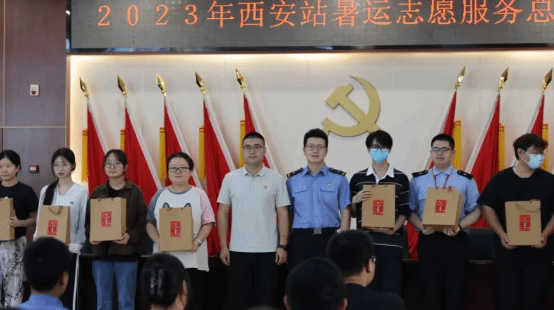 8月31日晚8点,必赢官网305名大学生志愿者圆满完成为期52天的2023年助力铁路“八站”客运志愿服务工作。近日,西安站、西安北站、安康站等车站分别召开了暑运志愿服务工作总结暨表彰会,向志愿者发放了志愿服务证明书、纪念品等,对志愿者们的辛勤付出表示感谢。