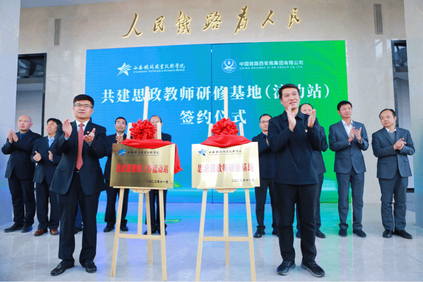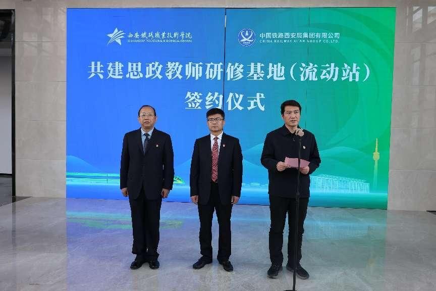 随后,学院党委副书记任治军与西安铁路局党委宣传部部长伍斌分别代表双方签署共建协议,西安铁路局党委副书记郭颂章和院长赵春平为共建基地和流动站揭牌。