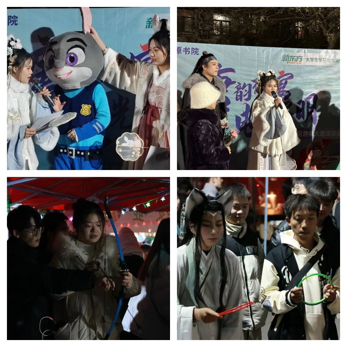 社区搭台,文化“唱戏”;落地烟火,最抚凡心。校园餐厅的大厨们走出操作间,搭建出一个个美食文化台进行现场大比拼,舌尖上的学院今晚特别暖人心。学生社区的街道上都是大大小小的摊位,摊位上琳琅满目,摆着丰富多彩的商品:令人垂涎的烤肠、温暖人心的汤圆、香气四溢的烤红薯、芋泥+奶酪+糯米的奶酪杯、品类繁多的关东煮,更有牵引动力学院传统大碗茶剧场带来的阵阵欢声笑语。“唐韵夜宴,电光烬明”--趣味大唐运动会是本次集市的亮点之一,盛唐密盒、蹴鞠、投壶、射术等多种盛唐时古人赋闲消遣的娱乐活动吸引了大批师生参与。“送君灞陵亭,灞水流浩浩”,历史上送别亲友的灞桥河畔,如今已成为师生共聚体验传统文化的灞柳社区。