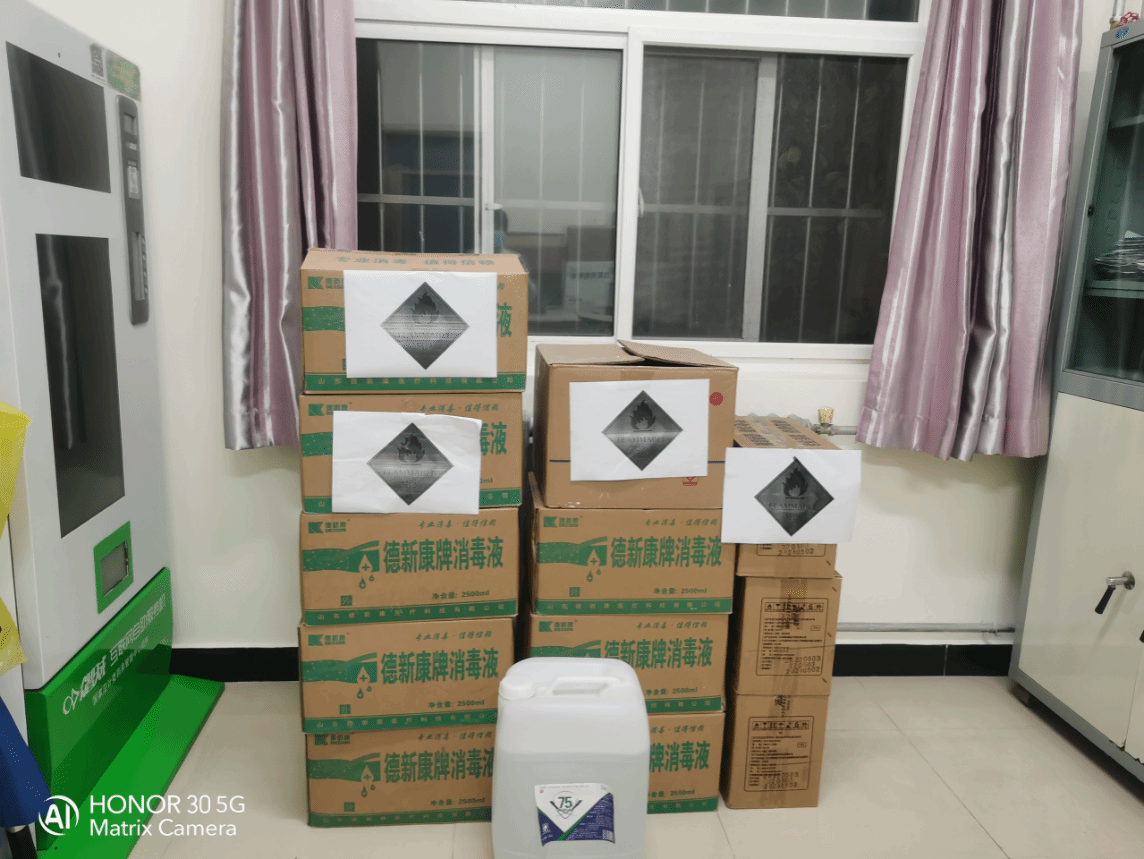 卫生防疫科对科内安全隐患进行排查,目前,存在安全隐患的物资共有以下三种;酒精、过氧乙酸和84消毒液,分别存放在阴凉、避光、干燥、通风处,存放时不能和其它物混放,单放在闭光通风房间,并保证暖气阀门已关闭,非专业人员不能提取与配置。