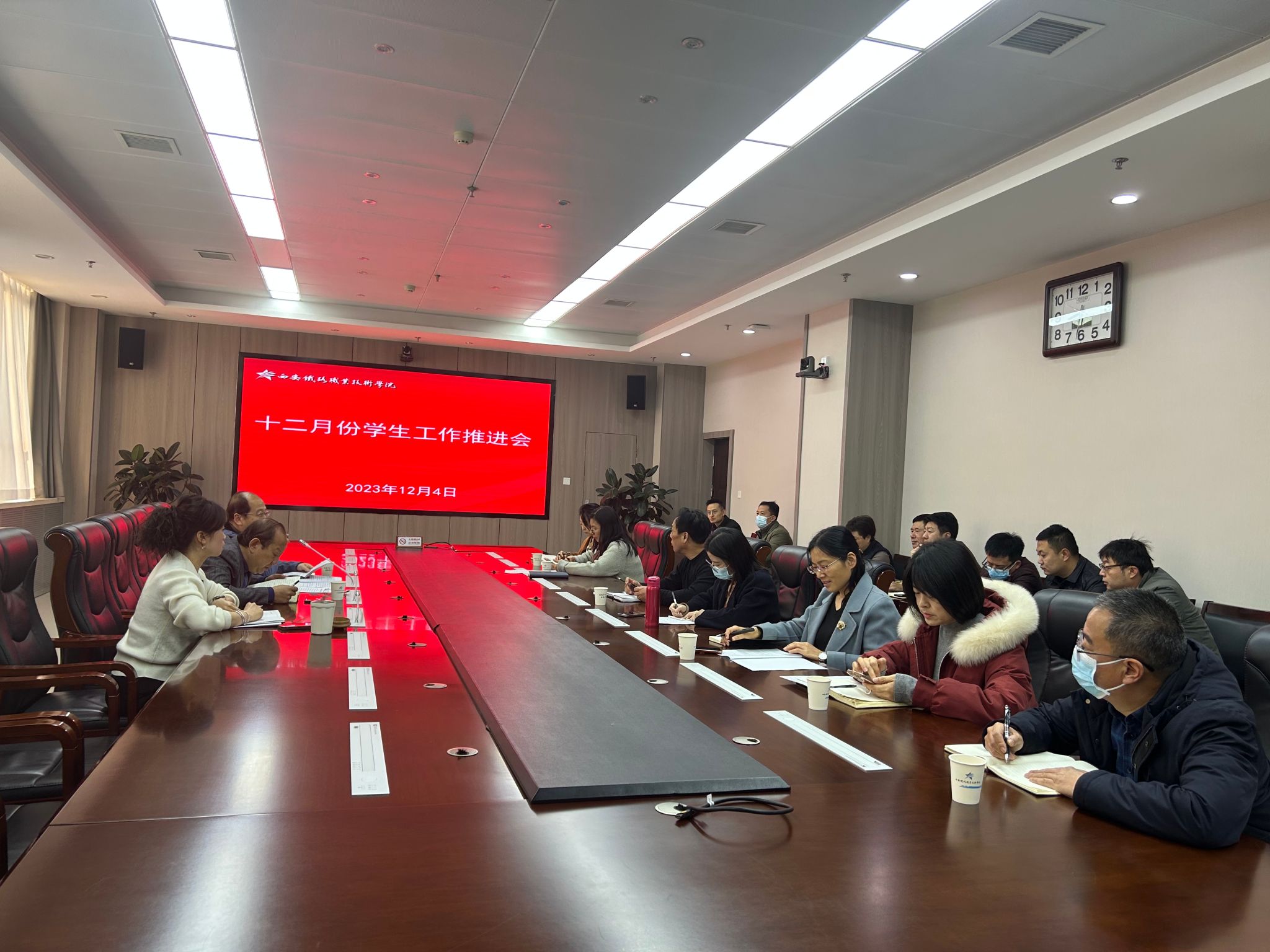 12月4日,学院在港务校区六楼第三会议室召开了十二月份学生工作推进会。学院党委副书记任治军,党委学生工作部、团委全体处科级干部,各二级院(部)党总支书记、国际交通学院副院长以及各院部学工办主任参加了会议,会议由党委学生工作部部长李栋主持。