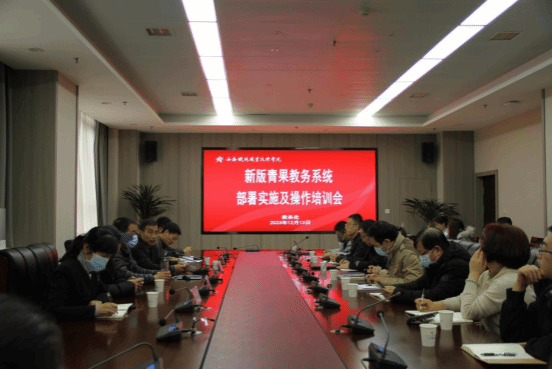 12月13日下午,学院在港务校区行政楼五楼会议室召开新版青果教务系统部署实施及操作培训会,学院副院长安学武出席培训会。教务处、现代教育技术中心、发展规划处等职能处室负责人,各二级院部教学副院长、办公室主任(教务科科长、综合办主任)及教学管理业务负责人员共计40余人参加本次培训会。