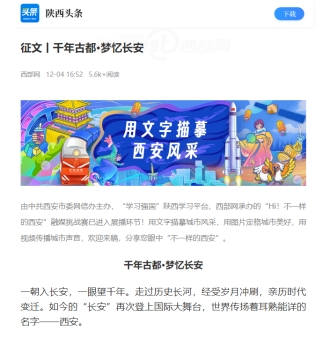 12月6日,活动开启网络投票环节,引发了市民参与热潮,累计投票超过30万人次。在上千件作品中,田瑞华的文章《千年古都·梦忆长安》入围100件优秀作品,并在西部网、“学习强国”陕西学习平台以及陕西头条上发布。经过为期七天的网友投票,田瑞华的作品最终获得4074票,文章阅读量达到了5600+。
