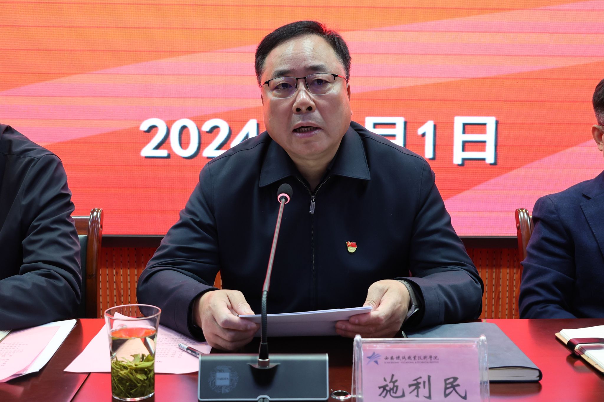 施利民充分肯定了学院2023年工作,从省内外、校内外等方面分析研判学院发展面临的形势和存在的问题出发,强调要做好2024年工作,重点“聚焦1个目标、做到3个持续发力”。一是聚焦创建国家“双高计划”建设院校,在深化党的建设上持续发力。进一步强化政治自觉,进一步深化“双创”工作成效,打造高素质、专业化干部队伍,坚定推进全面从严治党。二是聚焦创建国家“双高计划”建设院校,在推进重点项目建设上持续发力。树立“项目为王”的理念,细化任务、压实责任,营造全员、全速推进项目建设的浓厚氛围。三是聚焦创建国家“双高计划”建设院校,在抓好校园安全稳定上持续发力。强调要“健全机制抓落实”“提升本领抓落实”“强化作风抓落实”,高标准高质量推动各项工作落实,创造实实在在的工作业绩。
