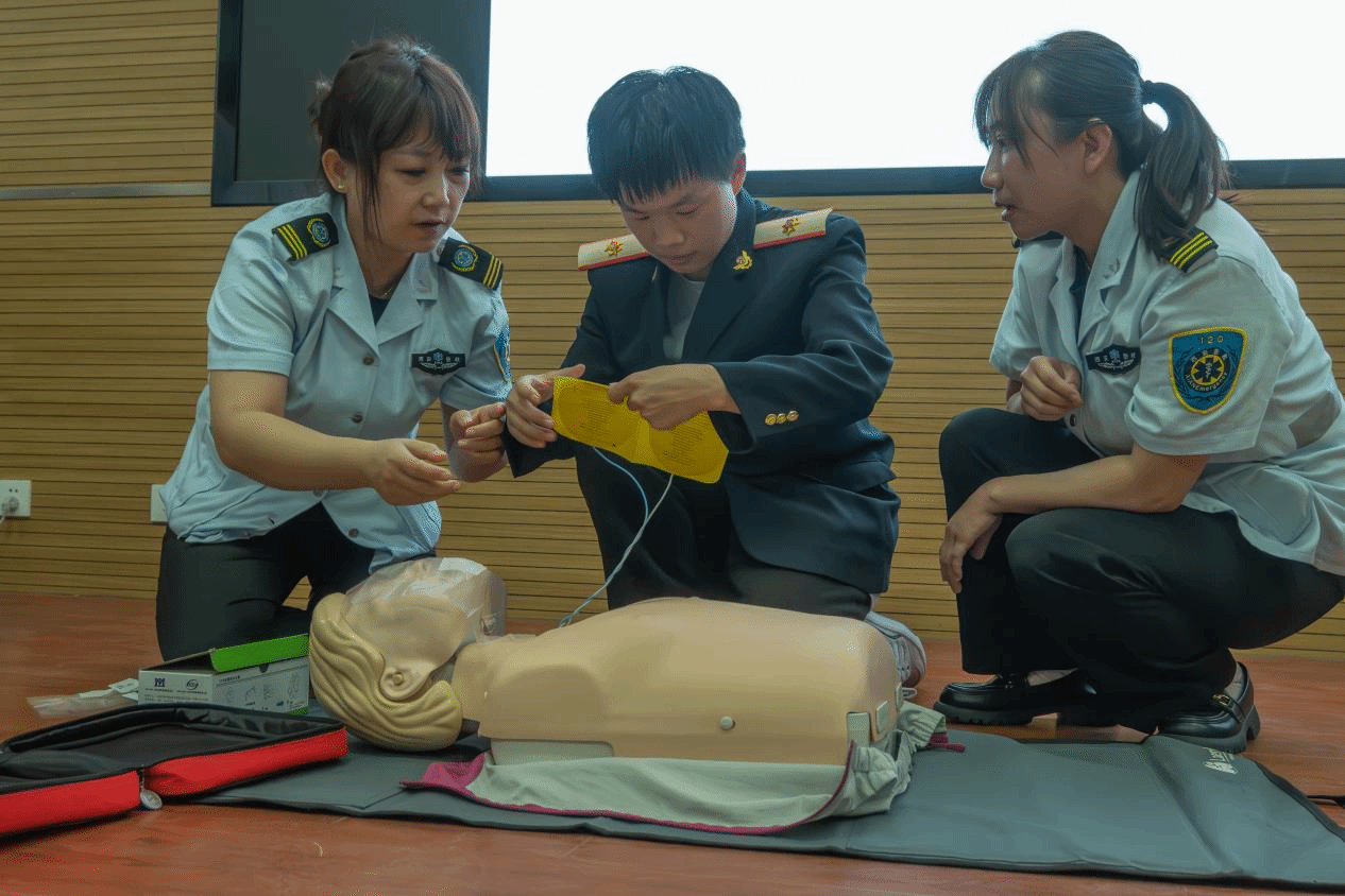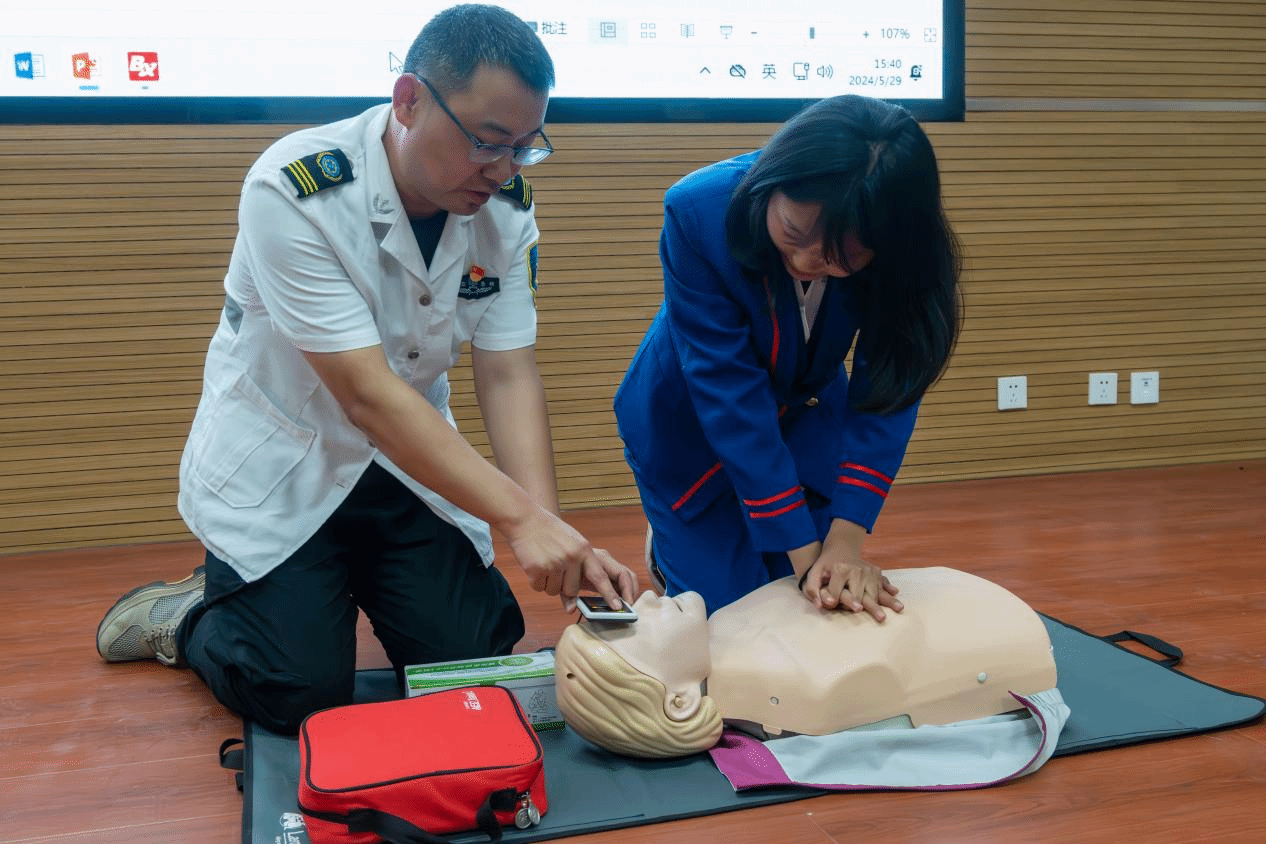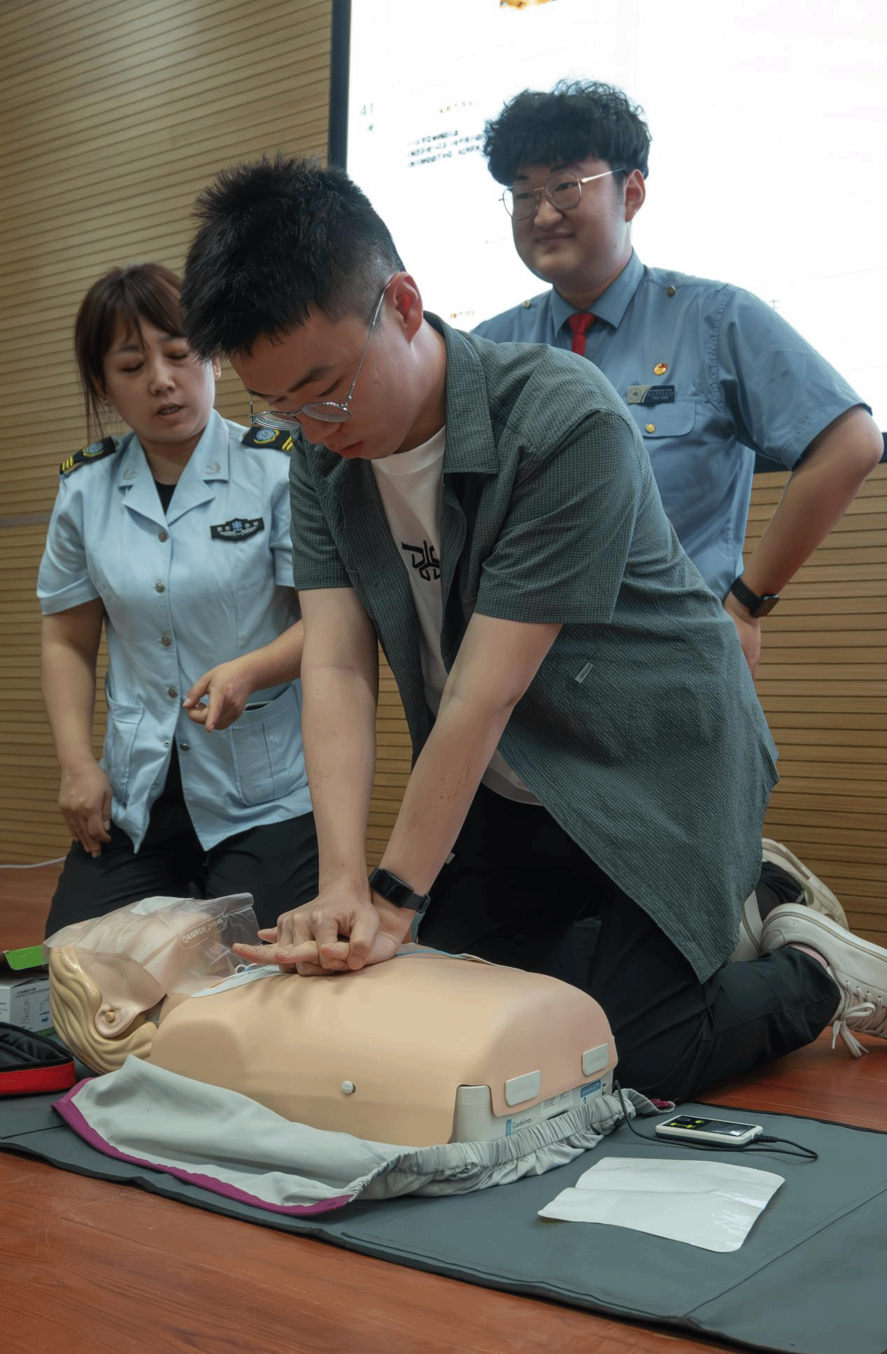 充分学习理论知识后,师生们积极踊跃的上台实践,亲身体验心肺复苏、海姆利克救治法、外伤包扎等急救技能,在急救中心工作人员的耐心指导下,反复练习各项急救操作,熟悉每一个步骤,确保动作标准到位。