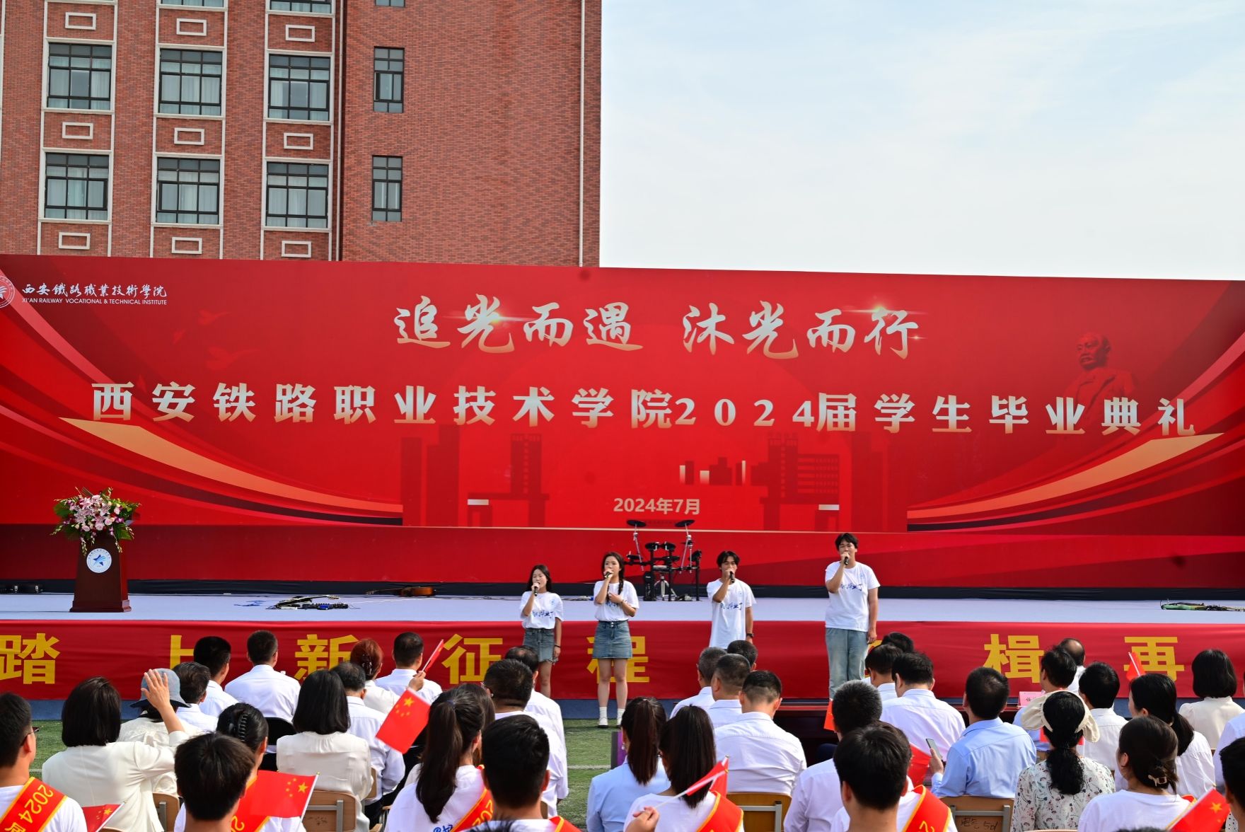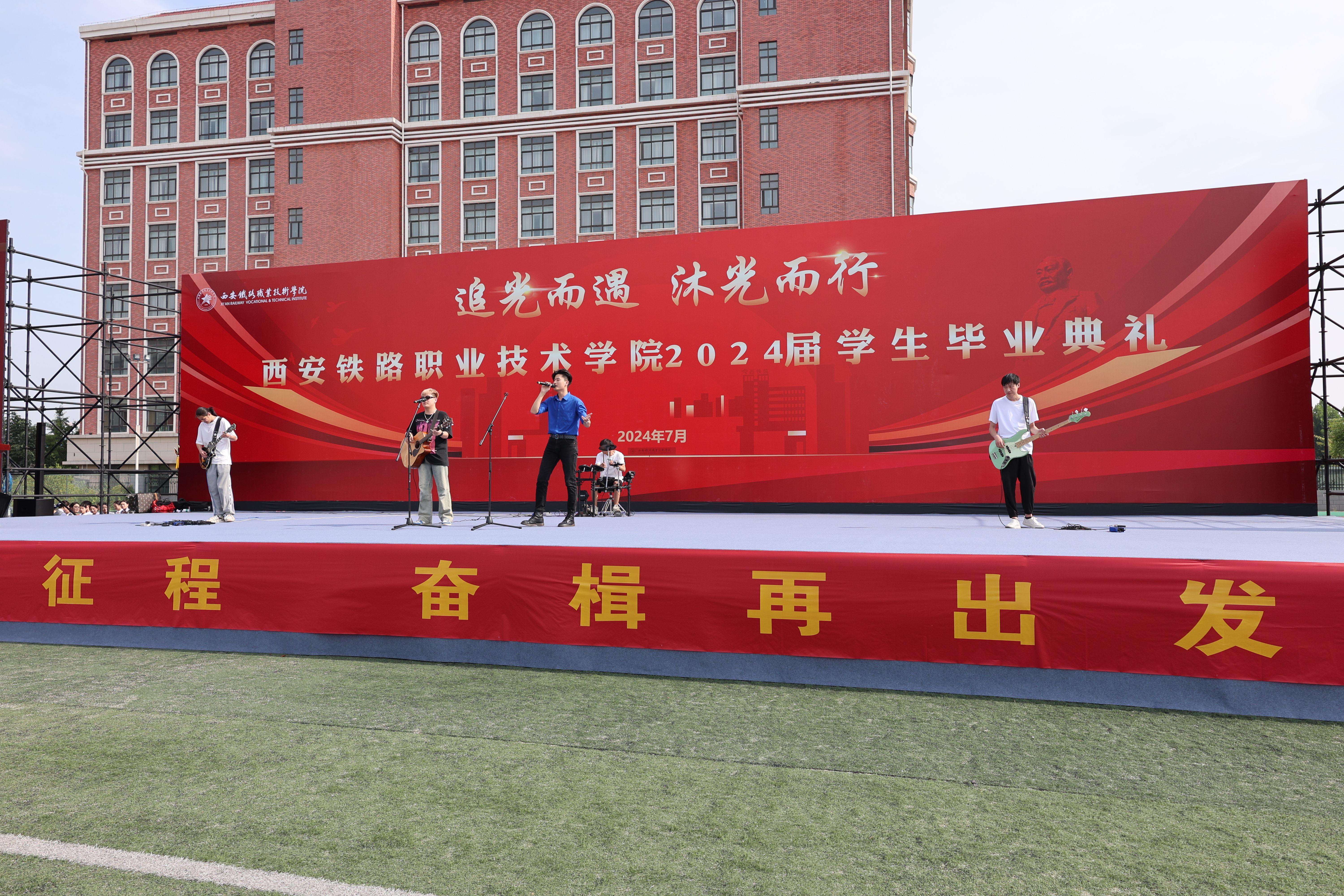 在典礼开始前,校园十大歌手以动人心弦的歌曲串烧点燃了现场气氛,青春洋溢的旋律激荡在每一个角落。南门巴士乐队以其卓越的演奏技艺,为全校师生带来了《西安人的歌》《曾经的你》《海阔天空》三首经典曲目。乐队深情款款的演绎和震撼人心的歌声,不仅为毕业典礼增添了浓厚的艺术氛围,更让每一位与会者沉浸在无限的回忆与感动中。