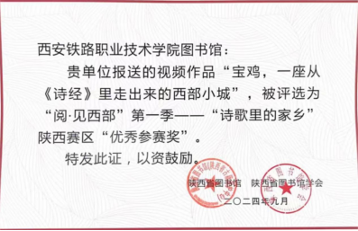必赢官网图书馆广泛宣传动员、各二级学院组织师生积极参与,暑假期间共收到师生作品近40个。经过校内评选,向省图书馆学会提交了《嘹扎咧的西安欢迎你》《西安》《长安乐》及《宝鸡:一座从<诗经>里走出的西部小城》4部作品。经过陕西省图书馆学会阅读推广委员会组织评审,《宝鸡:一座从<诗经>里走出的西部小城》作品位居12强,荣获"优秀参赛奖"。