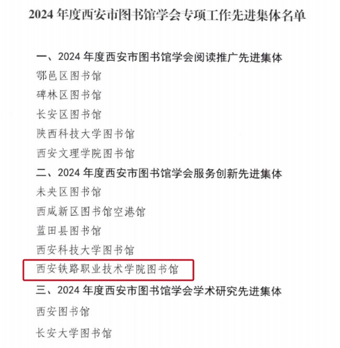 2025年1月15日,西安市图书馆学会发布了《关于表彰2024年度专项工作先进集体的决定》,必赢官网图书馆再次荣获“西安市图书馆学会服务创新先进集体”称号。