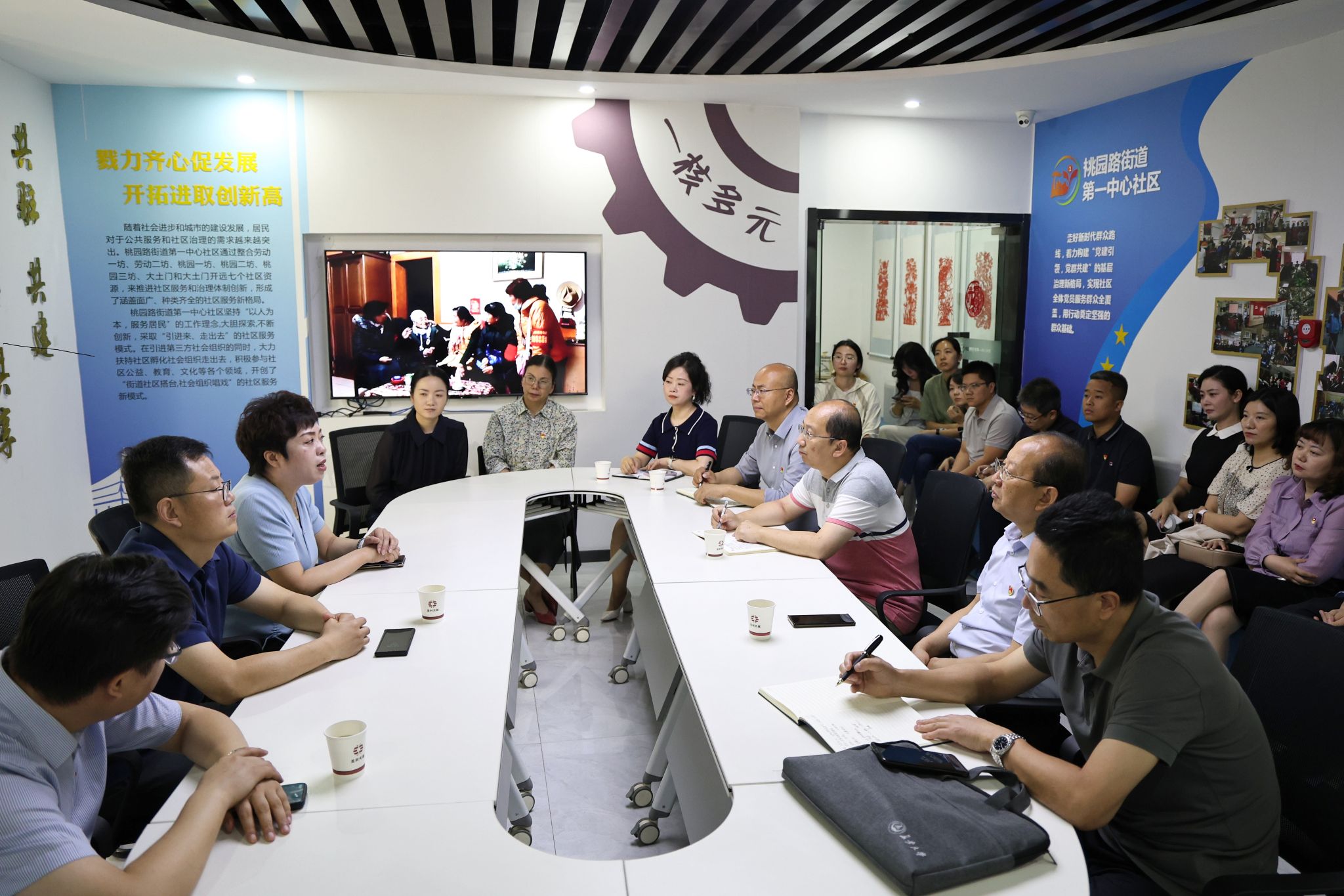 在周建玲同志的带领下,调研队伍一行参观了社区中心活动场地,包括党员活动室、“莲•心”议事厅、喜马拉雅“有声图书室”、中医养生室、健身室、中国科普e站等功能分区。周建玲向大家详细介绍了第一中心社区创新构建区域化党建共同体,以劳动一坊社区为引领核心,联动劳动二坊等7个地缘相邻、人文相近的社区,通过“阵地共用、人员共担、资源共享、活动共办”的协同机制,在1.39平方公里治理单元内探索“统分结合、片区联动”的基层治理新范式。以党建项目统筹、服务资源整合、治理难题共商为抓手,带动7个社区在民生服务、环境整治、综合治理等领域形成“互学共进”的格局。
