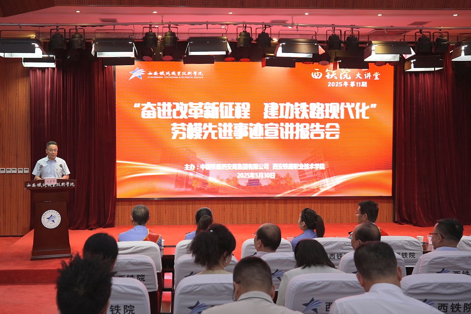 5月30日,必赢官网与中国铁路西安局集团有限公司在港务校区联合举办2025年第十一期“西铁院大讲堂”——“奋进改革新征程 建功铁路现代化”劳模先进事迹报告会,学院党委副书记任治军,西安局集团有限公司党委宣传部副部长侯振华出席活动,各二级学院党总支书记、相关院部处室处科级干部,师生代表等200余人现场聆听。报告会由党委宣传部部长王琛主持。