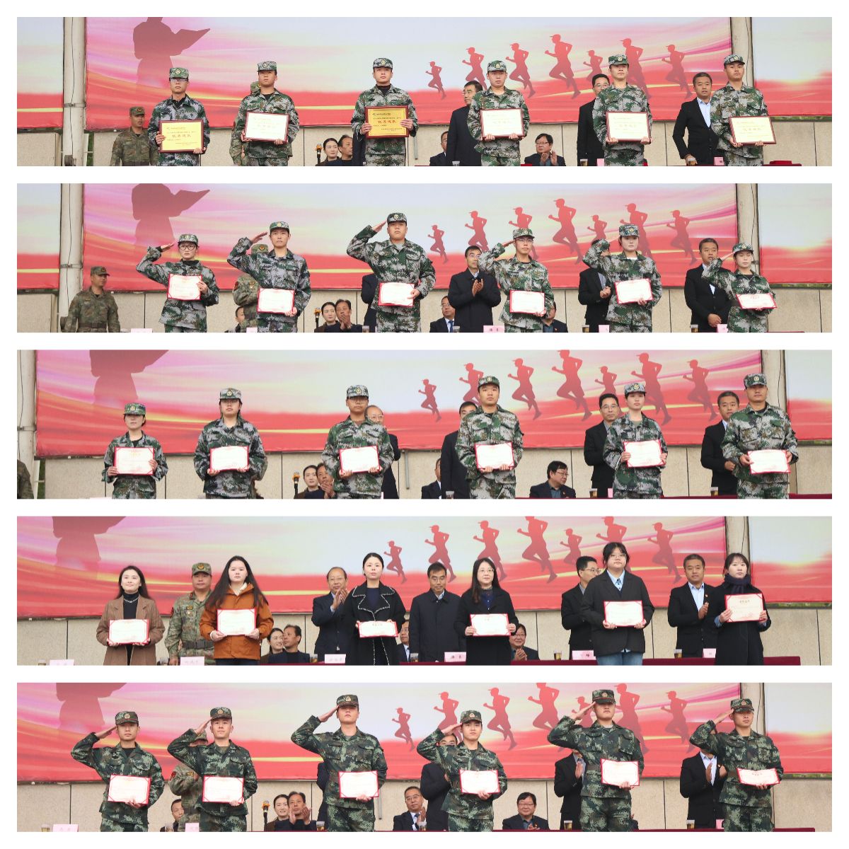 在隆重的表彰环节,滕勇宣读了《嘉奖通令》。他强调,大学生军训是全面推进国防和军队现代化建设的重要举措,经军训领导小组决定,授予13个连队“优秀连队”荣誉称号,14名教官“优秀教官”荣誉称号,28名老师“优秀指导员”荣誉称号,176名同学“军训标兵”荣誉称号,295名学员“优秀学员”荣誉称号。主席台领导为获奖集体和个人颁发了荣誉证书。