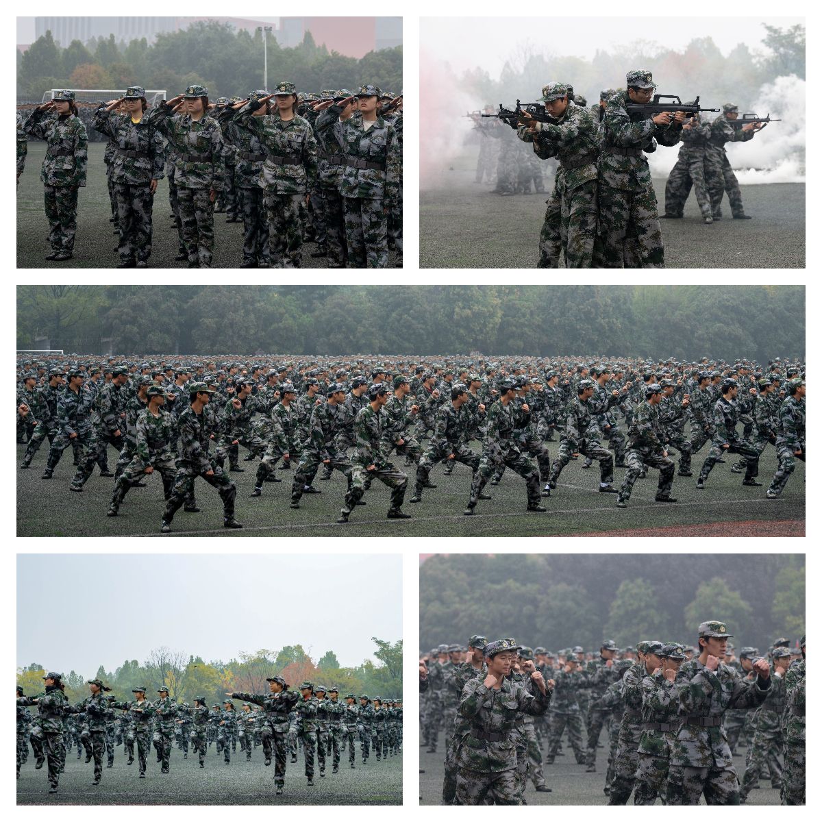 上午9时,大会在庄严的《解放军进行曲》中拉开帷幕,各受训方队依次通过主席台接受检阅,他们步伐铿锵、口号嘹亮,以饱满的精神状态展示了为期两周的军训成果。在军训成果汇报环节,学员们先后进行了队列展示、军体拳表演、健康操展示、战术训练演示和擒敌拳表演。队列展示精神抖擞,动作整齐划一;军体拳方阵招式凌厉、势如破竹;健康操表演融合动感音乐与时尚舞步,展现青春活力;战术训练展示包括战术手语、战斗姿势、前进编排、战斗小组等在内的战场生存技能,体现了严明的战场纪律;擒敌拳表演刚劲有力,展现过硬的军事素养和优良的战斗作风。