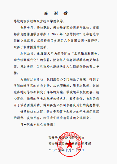 另一方面,组建了由教职工与学生志愿者服务团队,在场地引导、赛事协助、后勤保障等环节提供贴心服务,用热情与专业赢得了主办方与参赛选手的一致好评。西安铁路局集团公司老年人体育协会、西安铁路局集团离退休管理部联名发来感谢信。