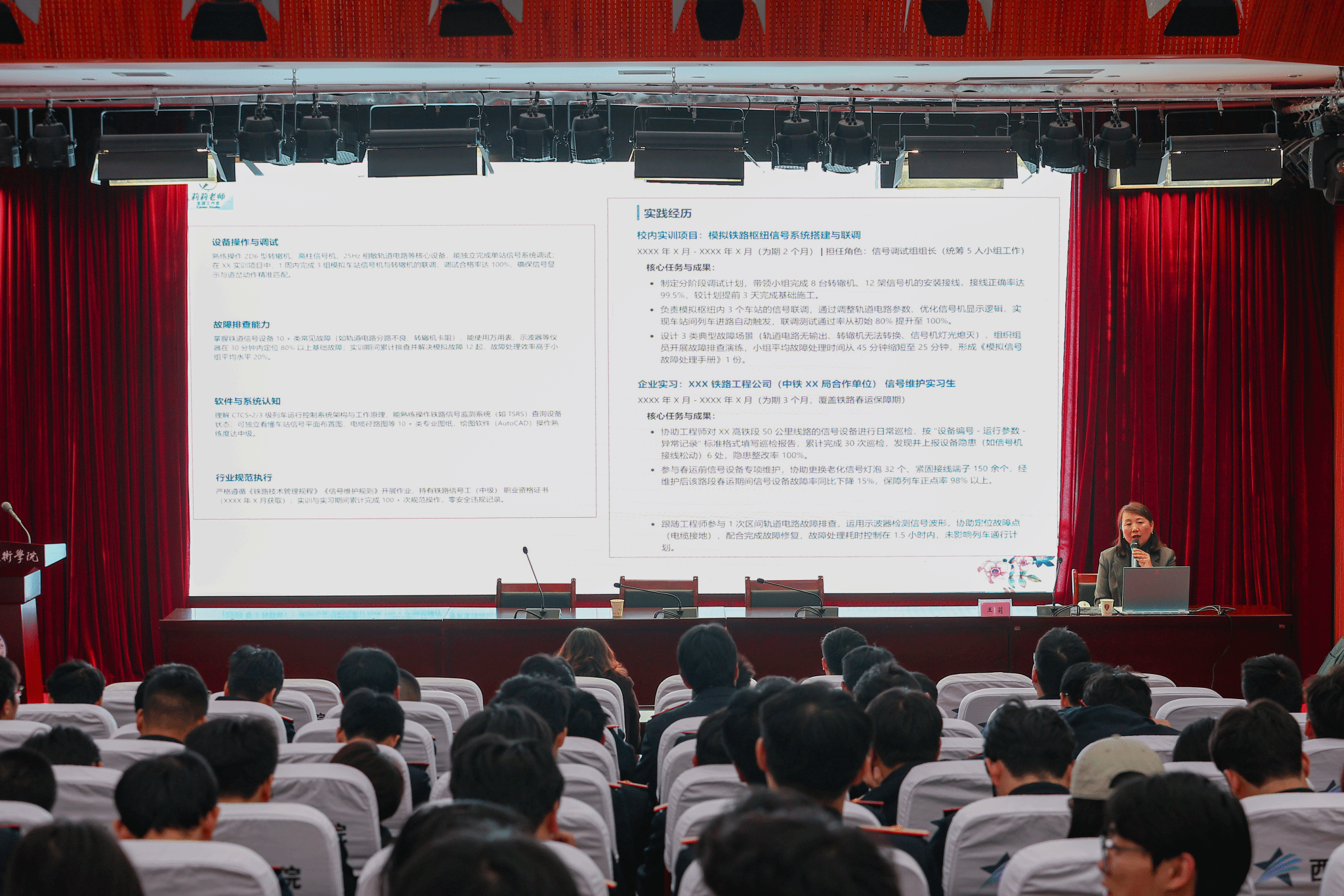 下午,学院特邀西北工业大学数学与统计学院党委书记王莉副教授(原职业发展指导服务中心主任)开展题为“AI赋能求职:铁路学子的简历与面试通关秘籍”的专题讲座。王莉书记结合三十余年丰富的就业指导经验,从人工智能技术对求职流程的深远影响入手,通过真实案例生动讲解了如何利用AI工具优化简历、模拟面试场景、分析岗位需求,为学生提供了实用性强、操作性强的求职方法。