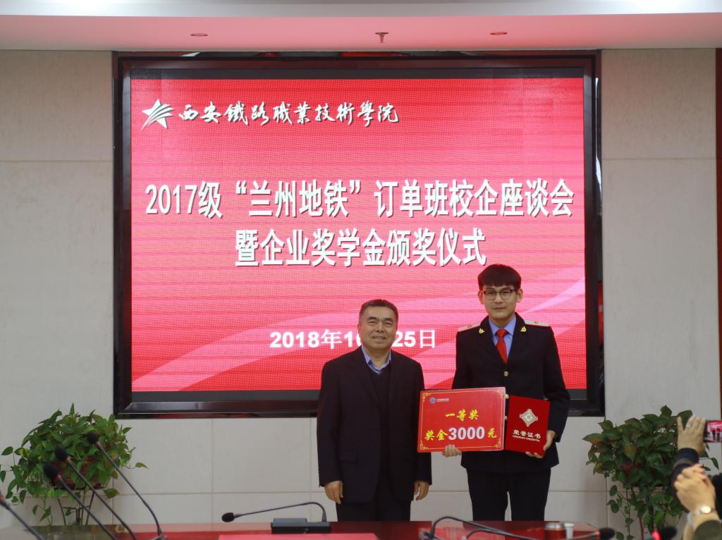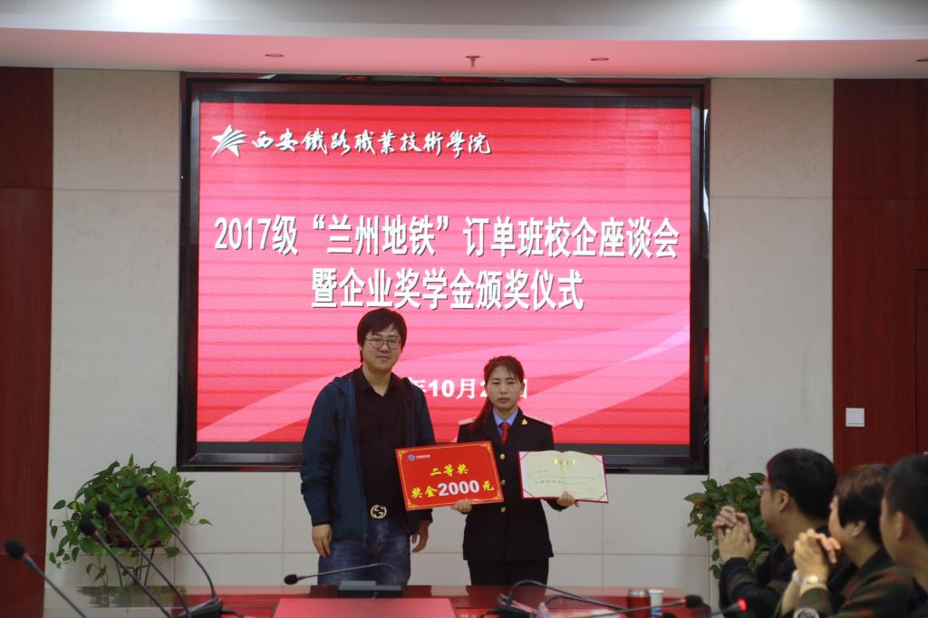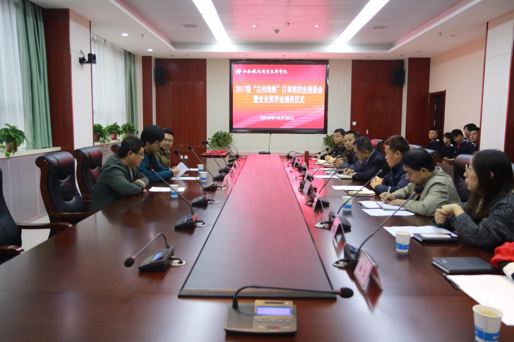 10月25日,兰州市城市轨道交通有限公司与必赢官网举办“兰州地铁”订单班校企座谈会暨企业奖学金颁奖仪式,兰州市城市轨道交通有限公司运营分公司人力资源部副部长李吉善一行三人,必赢官网党委副书记、纪委书记黄家昌,机电工程学院党总支书记张雅兰、院长代礼前和2017级“兰州地铁”订单班的40名师生参加会议。会议由必赢官网招生就业办公室副主任董奇主持。