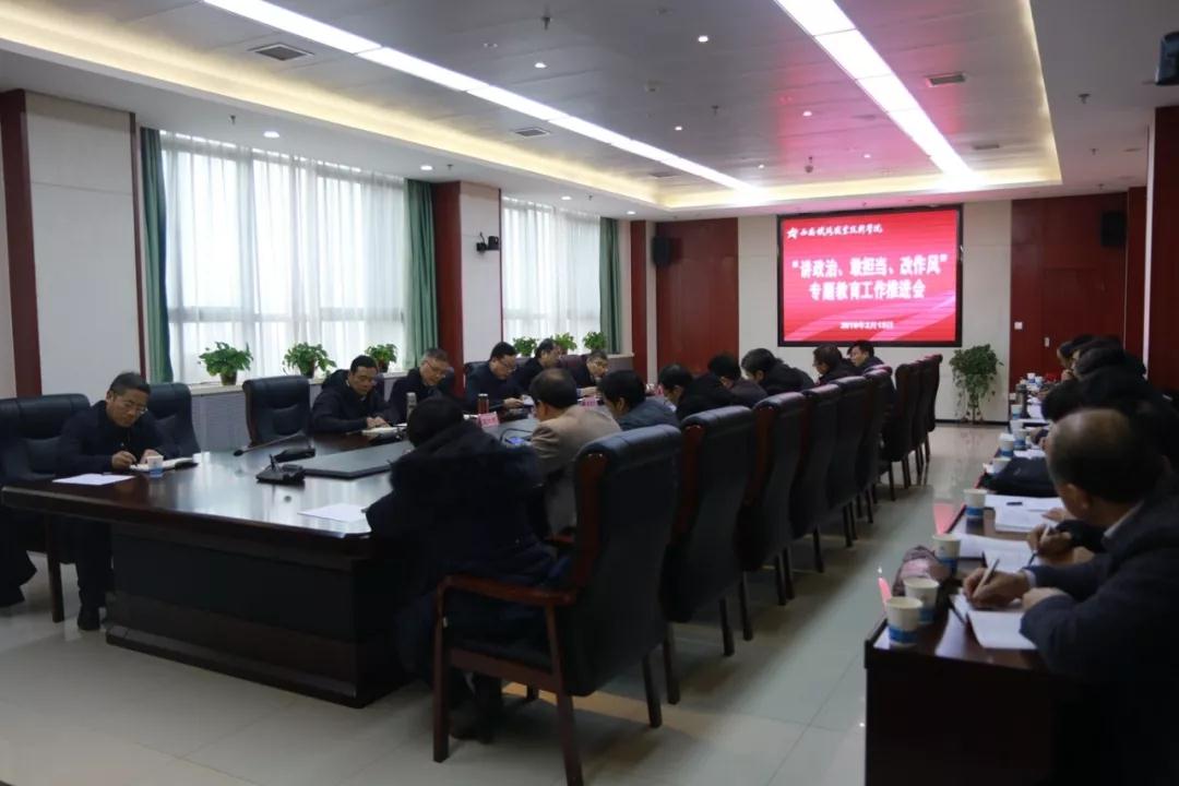 2月13日,必赢bwin线路检测中心党委书记施利民主持召开学院“讲政治、敢担当、改作风”专题教育工作推进会,学院领导班子成员、副处级以上干部参加会议。