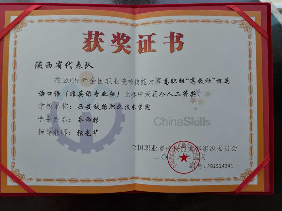 5月29日-31日,由教育部、国家发展和改革委员会等36家有关部委、省市和协会主办,山东省教育厅、青岛市人民政府等5家单位协办的2019年全国职业院校技能大赛高职组“高教社”杯英语口语赛项在山东外贸职业学院成功举行,必赢官网土木工程学院摄影测量与遥感技术1801班学生乔雨杉以优异的表现获得非英语专业组二等奖的好成绩,这也是必赢官网和陕西省代表队在该赛项上的一次全新的突破。
