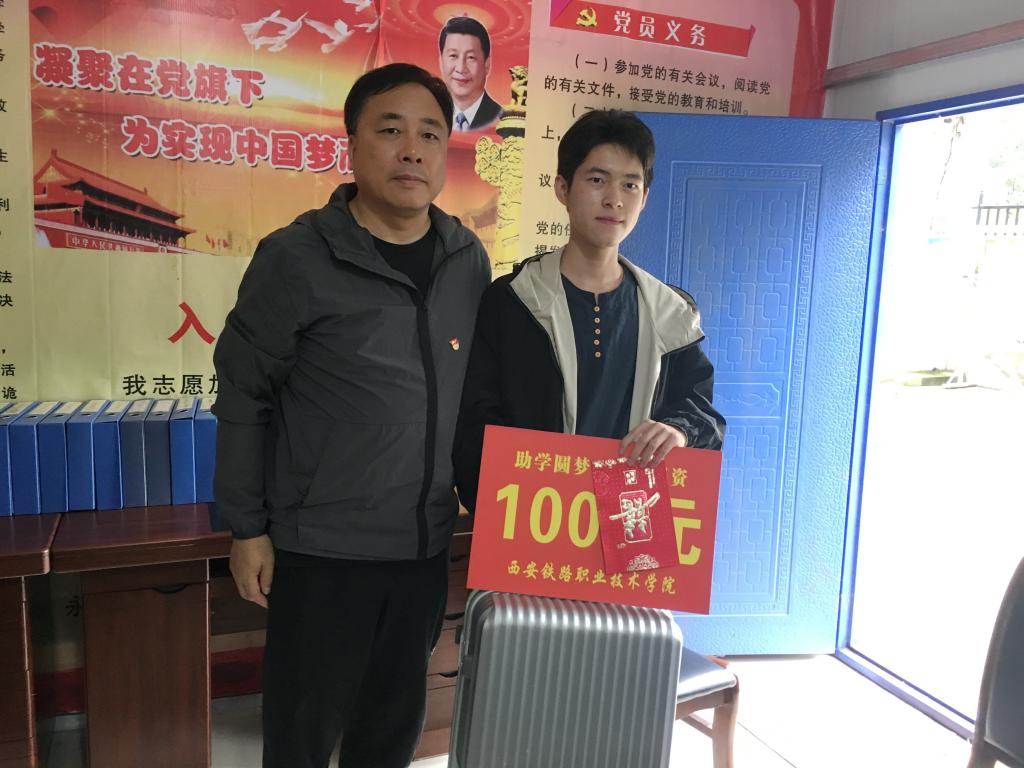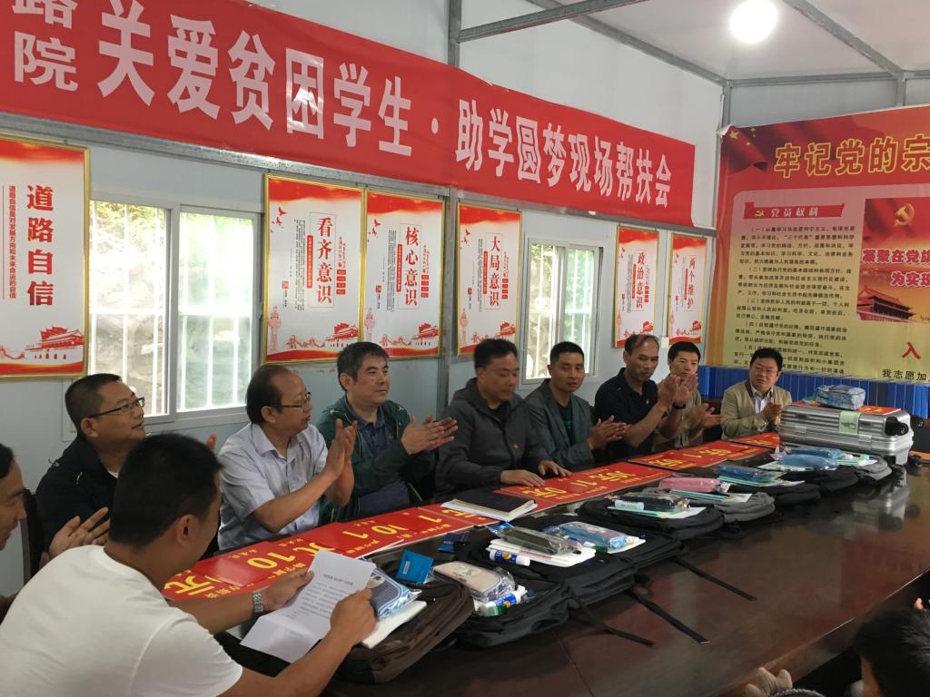 在关爱贫困学生·助学圆梦现场帮扶仪式上,施利民代表学院向六合村10名困难学生赠送了每人1000元累计1万元的助学资金以及行李箱、书包等学习用品。他希望学子们要点燃“青春梦”,奏响“未来曲”,奋力谱写多彩人生,永葆进取之志,坚定追梦之行,坚定报国之志,心怀感恩之情,努力学习回报社会。