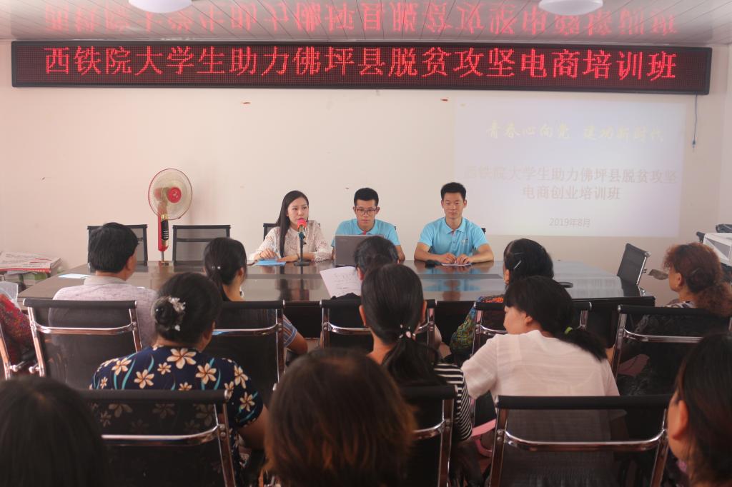 为贯彻落实陕西省委教育工委《关于组织开展“万名学子扶千村”2019年暑假社会实践脱贫攻坚专项活动的通知》精神和学院2019年度扶贫工作相关安排,进一步加强必赢官网青年学生的社会责任感与使命感,助力脱贫攻坚,8月8日,西铁院大学生助力佛坪县脱贫攻坚爱心团队来到佛坪县袁家庄街道办事处塘湾村,为当地正在创业或有创业想法的60余名群众代表开展电商创业培训班。