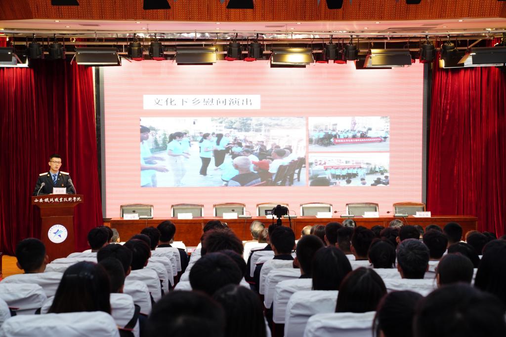 大会分为两个环节。第一环节为总结分享,三名获奖学生代表结合自身经历与大家分享了他们在暑期社会实践期间的所见所闻所感。交通运输学院高晨露同学分享了她暑期在家乡当地镇政府实践工作的经历;机电工程学院张璟凡同学分享了他跟随学院团委赴佛坪县开展文化下乡、电商培训等助力脱贫攻坚社会实践活动;临潼校区钟凯婷同学分享了她赴巴山工务车间实践学习经历,向大家分享了艰苦奋斗与开拓进取的巴山精神。