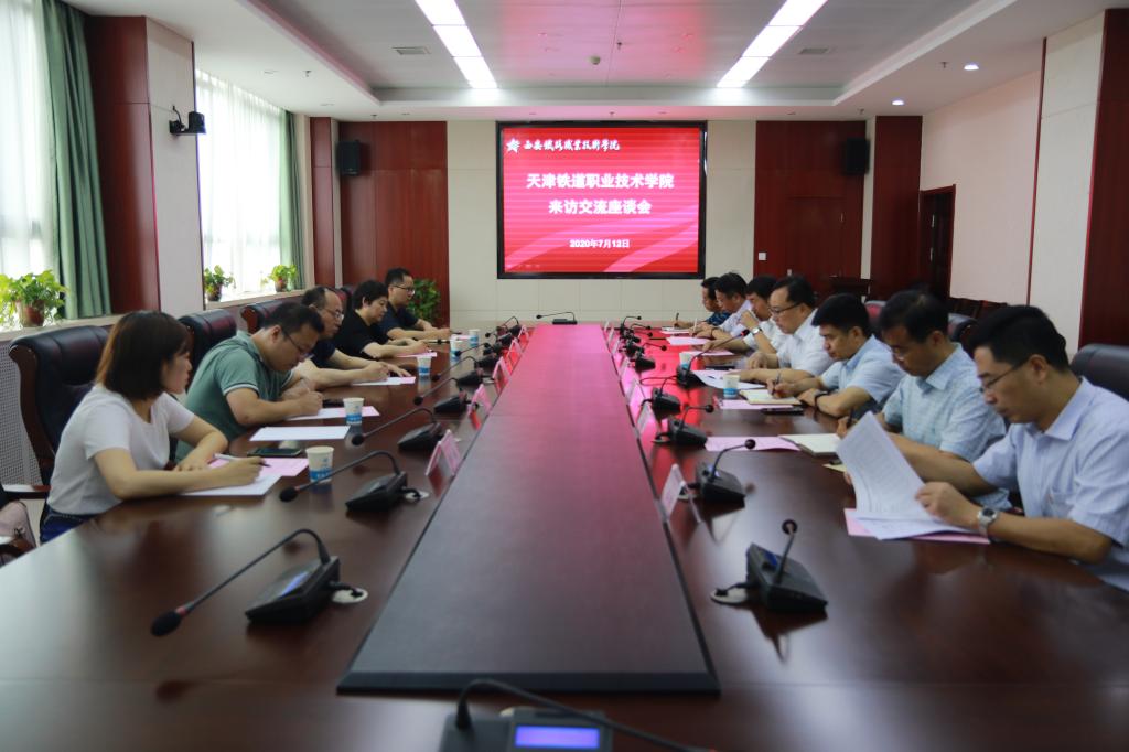 7月12日,天津铁道职业技术学院党委书记、院长于忠武,副院长李志慧一行来必赢官网交流访问。必赢官网党委书记施利民、院长赵春平、副院长安学武陪同客人参观并召开座谈会。
