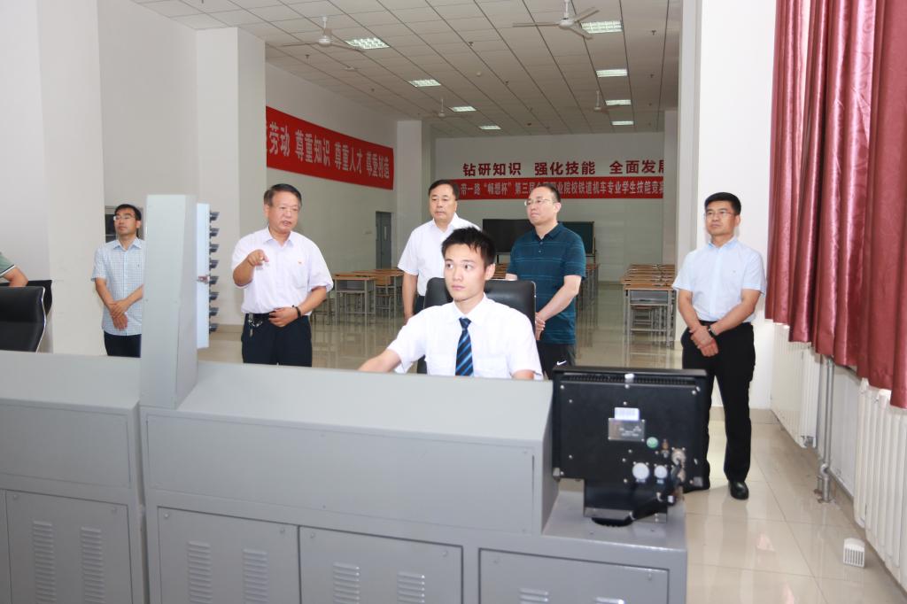 于忠武一行先后参观了学院党建文化长廊、师生政治生活馆、牵引动力学院相关实训室及轨道交通专业综合演练场。