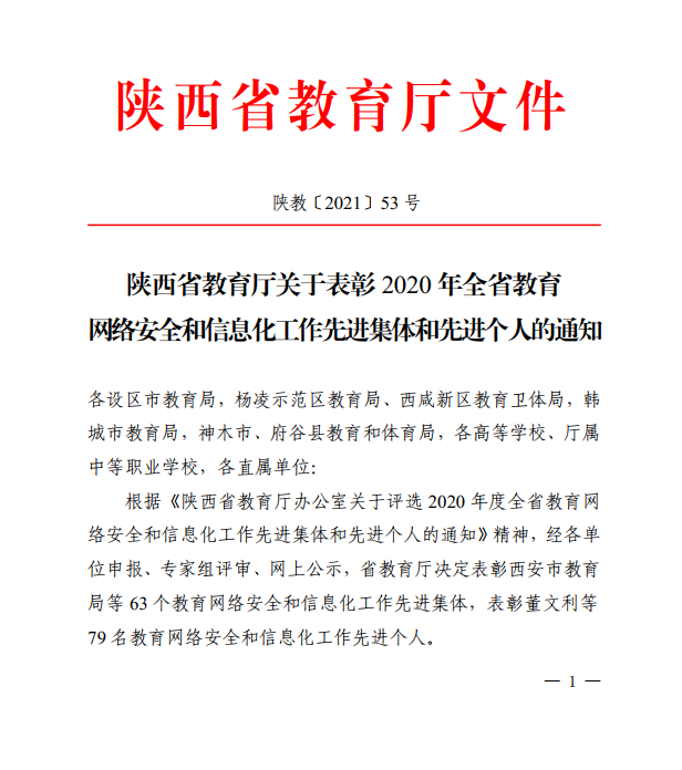 近日,陕西省教育厅发布了《关于表彰2020年全省教育网络安全和信息化工作先进集体和先进个人的通知(陕教【2021】53号)》,必赢官网荣获“2020年全省教育网络安全和信息化工作先进集体”称号,黄小明同志获得“先进个人”称号。