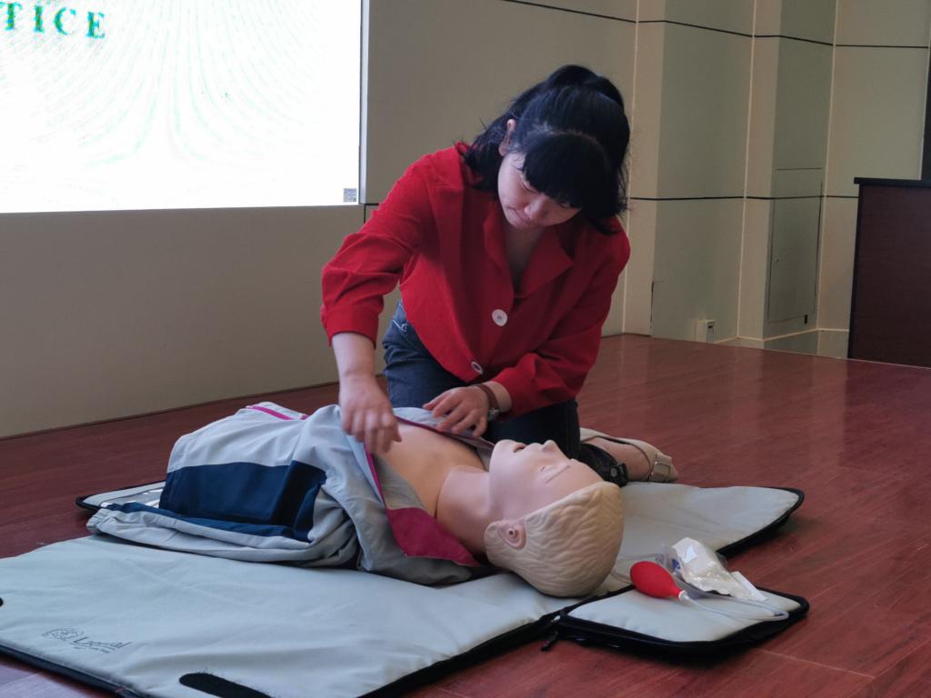 培训过程中,现场的实习指导教师、实习学生亲自进行演练,进行心脏复苏操作,从环境评估到胸外按压,从手法要求到时间控制,严格按照标准进行。