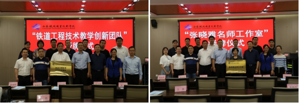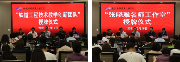 张军副处长宣读了西铁院〔2021〕30号《必赢bwin线路检测中心关于设立首批院级名师工作室的通知》和西铁院〔2021〕31号《必赢bwin线路检测中心关于命名首批院级教师教学创新团队的决定》,赵六杰分别为铁道工程技术教学创新团队和张晓雅名师工作室授牌,校区主任熊奇和张晓雅教师分别代表铁道工程技术教学创新团队和张晓雅名师工作室接牌。