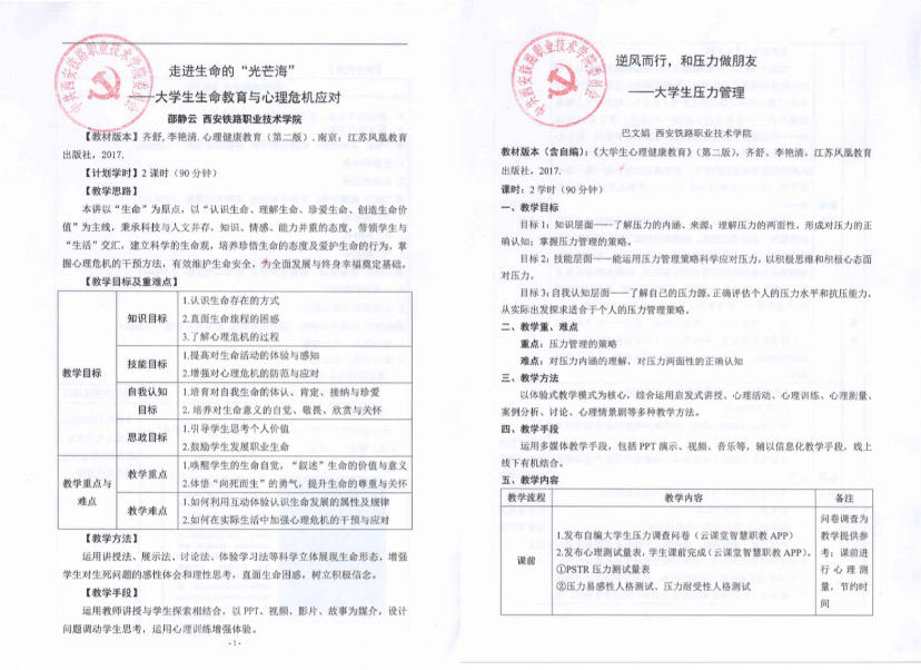 参加陕西高校第三届心理健康教育优秀教案评选活动,选送马克思主义学院教师邵静云的《走进生命的“光芒海”——大学生生命教育与心理危机应对》和巴文娟的《逆风而行,和压力做朋友——大学生压力管理》均获二等奖。