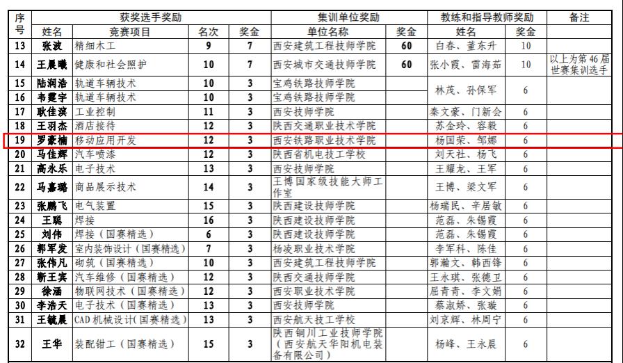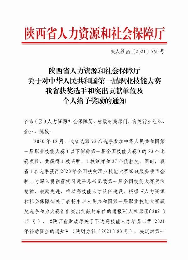 近日,陕西省人力资源和社会保障厅下发《关于对中华人民共和国第一届职业技能大赛我省获奖选手和突出贡献单位及个人给予奖励的通知》,必赢官网2019级学生罗浩楠代表陕西省参加中华人民共和国第一届职业技能大赛“移动应用开发”赛项并荣获优胜奖,作为在校生晋升技师(二级)职业资格;同时,学校荣获突出贡献单位。
