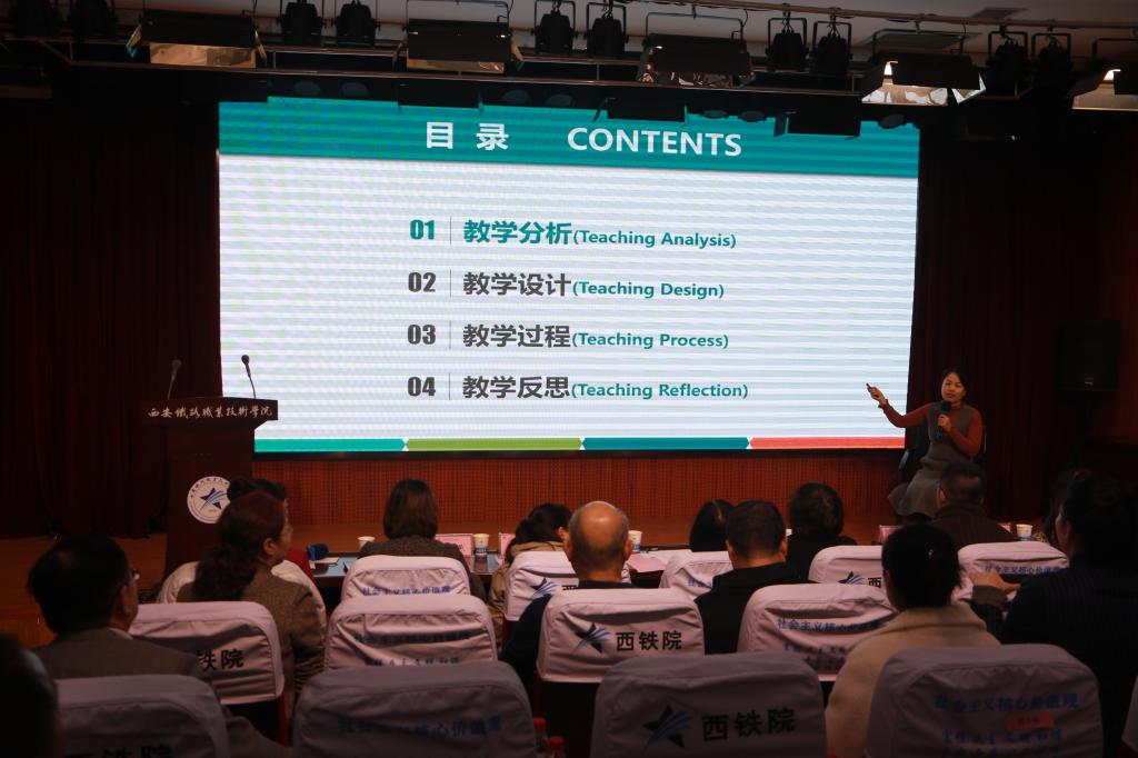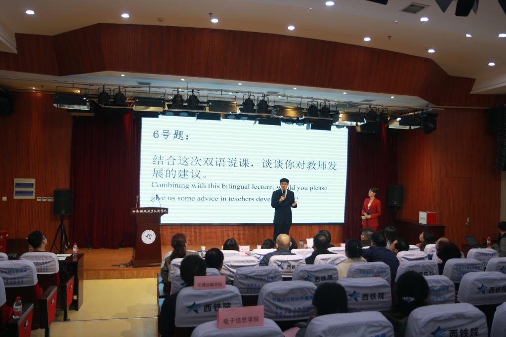 按照赛前抽签结果,10位选手按次序依次上场。每人进行15分钟的“双语”说课展示,然后现场抽取外语能力测试选题,由评委提问,选手用外语进行即兴作答,以此考验参赛选手的“双语”说课能力和外语应用水平。评委根据参赛选手的语言表达能力、教学仪态仪表、教学理念、教学内容、教学设计、课件制作水平及说课效果等表现进行综合评分。