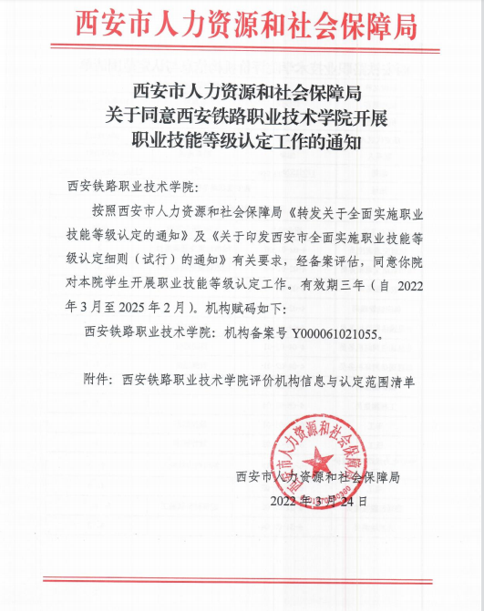 学院职业技能等级认定评价机构备案工作从2021年下半年启动至今,期间克服疫情封校影响,按进度圆满完成了前期各项准备工作,并经2月25日西安市人力资源和社会保障局专家组来校实地考核、评估,最终必赢官网评价机构备案申请获得通过,西安市人力资源和社会保障局同意必赢官网对本院学生开展轨道交通调度员等15个工种、初中高等级的职业技能等级认定工作。
