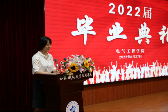毕业生代表、铁道供电1902班周思怡同学在发言中,向辛勤育人的老师、学院领导和母校表达了感激之情,深情回忆了难忘而宝贵的大学成长经历,表示要在这个充满无限机遇与可能的时代,不断创造人生的精彩。20级学生马欣妍代表在校生为学长学姐们送上一份真挚的祝福,表示将沿着他们的足迹,成长为优秀的西铁院学子。