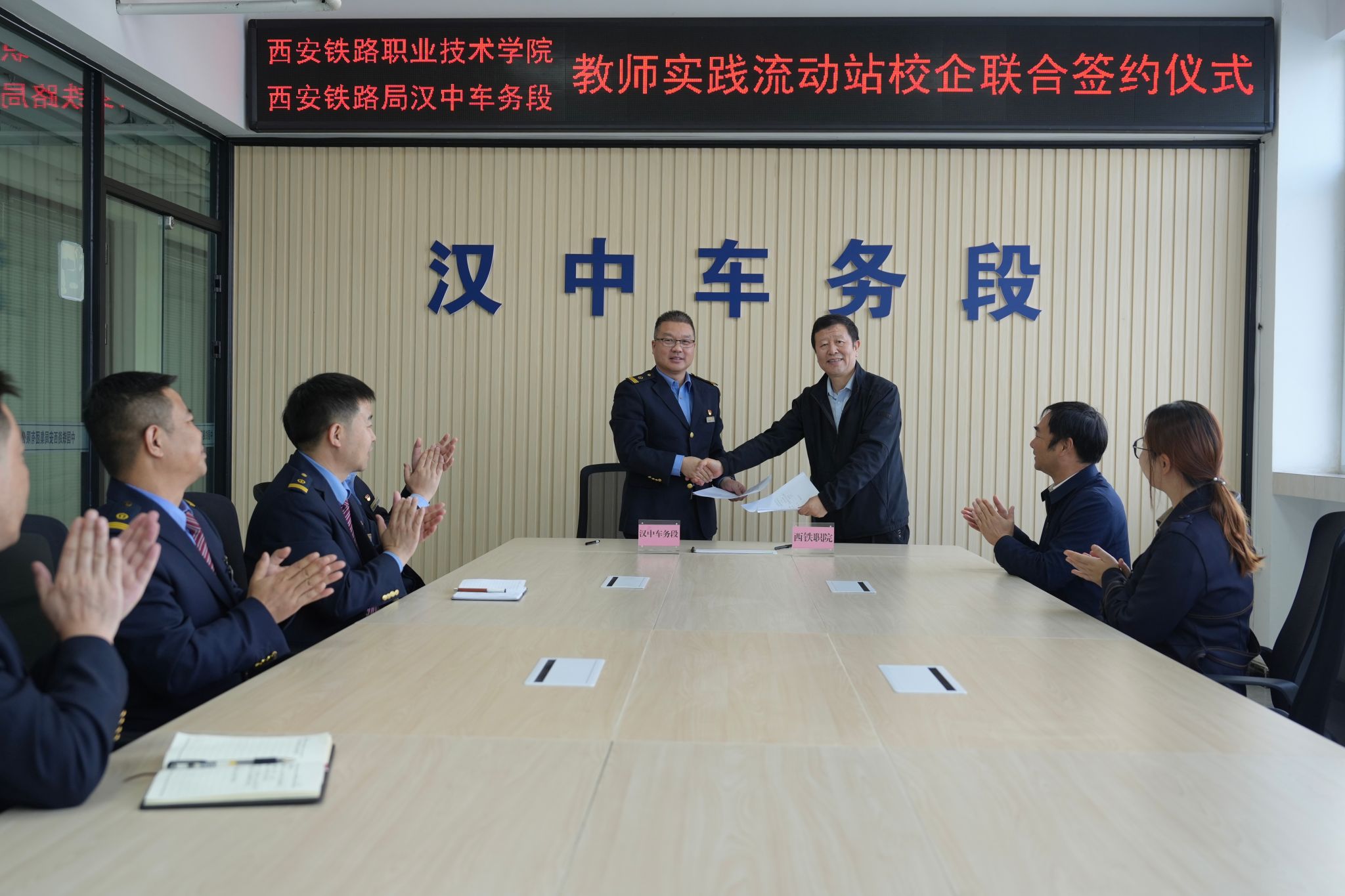 10月12日,必赢官网交通运输学院院长徐小勇教授、交通运输学院副院长刘新强教授赴西安铁路局汉中车务段,洽谈并签署教师企业实践流动站试点建设校企联合协议。西安铁路局汉中车务段段长韩博,汉中车务段党委书记申琦、党委副书记兼纪委书记李晓波、副段长王辉、汉中车务段职教科科长刘平先、汉中车务段技术科科长朱光勇出席了签约仪式。