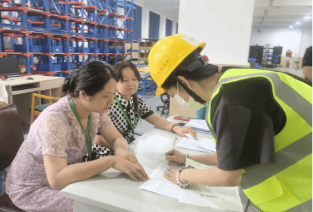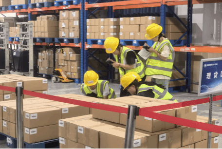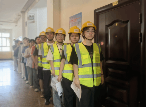 下午,学生在智慧物流实训中心进行线下实操考核,学生戴安全帽列队整齐,整装待发。
