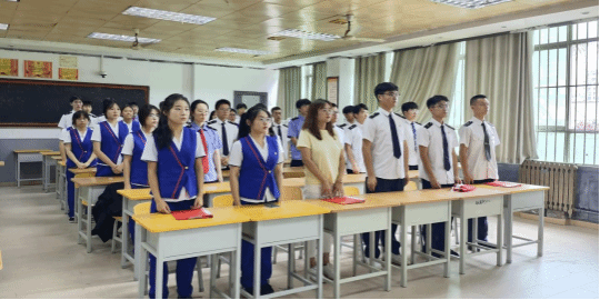 仪式在庄严的国歌声中拉开序幕,全体师生肃立,高唱国歌,表达对祖国的热爱和敬意。团员代表张文澜宣读了新团员名单,并向他们表示热烈的祝贺。在团旗的见证下,老团员为新团员佩戴团徽。团徽在胸前闪耀,不仅是一份荣誉,更是一份责任,它象征着新团员们将肩负起时代赋予的重任,为实现中华民族的伟大复兴而努力奋斗。