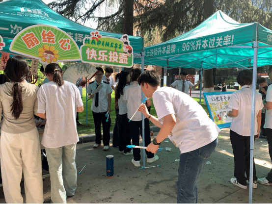 “体劳强心”趣味活动区更是欢声不断。投壶比赛中,参与者屏息凝神,瞄准目标;套圈游戏中,同学们眼疾手快,精准“收割”礼品。传统游戏与现代心理教育的结合,既锻炼了协调能力,也缓解了学业压力。