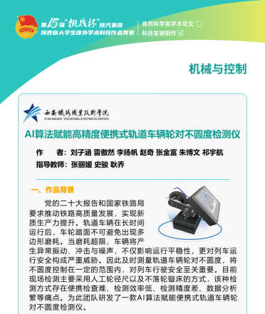 由机电院张丽媛,史骏等指导,刘子涵,雷傲然等提交的参赛作品《AI 算法赋能高精度便携式轨道车辆轮对不圆度检测仪》获一等奖;