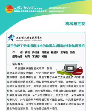 由机电院刘莉,郑强等指导,高哲等提交的参赛作品《基于伪双工无线通讯技术的轨道车辆智能铁鞋防溜系统》获一等奖;