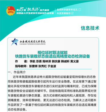 由机电院张曹慧,张秀红等指导,李航等提交的参赛作品《相位延时算法赋能铁路货车装载状态自适应高精度动态检测设备》获二等奖;