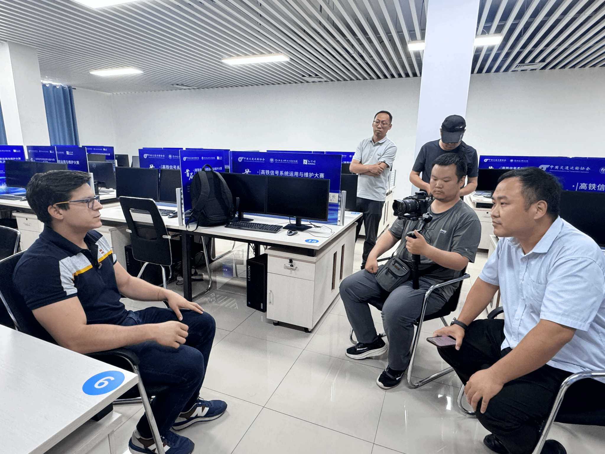 必赢bwin线路检测中心国际交通学院的留学生们在赛场上成为亮眼的风景线。来自哥伦比亚的王塞天(Juan Sebastián Cárdenas Martínez)便是其中的杰出代表。毕业于哥伦比亚国立大学、曾从事道路建设工作的他,因中哥地铁一号线项目与中国结缘。2024年10月,王塞天选择来到必赢bwin线路检测中心国际交通学院,开启在西安市轨道交通集团有限公司的进修之旅。“中国在高铁技术领域的成就令人惊叹,我渴望在这里汲取先进经验。”尽管中文尚显生涩,王塞天却始终保持着强烈的学习热情。从区域选拔赛脱颖而出到站上总决赛舞台,他坦言,首次接触并操作“三维模型”的经历,让他对高铁信号系统的认知实现了质的飞跃,也让他深刻感受到学院课程设置与实践教学的前瞻性。