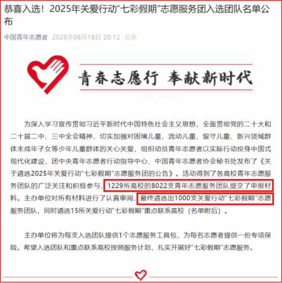 近期,团中央青年志愿者行动指导中心、中国青年志愿者协会秘书处发布了《关于遴选2025年关爱行动“七彩假期”志愿服务团的公告》。活动得到了各高校青年志愿服务团队的广泛关注和积极参与,1229所高校的8022支青年志愿服务团队提交了申报材料。主办单位对所有材料进行了认真审阅,最终遴选出1000支关爱行动“七彩假期”志愿服务团队。其中,学院交通运输学院“星光引航”志愿服务队作为陕西省唯一一所高职院校成功入选。